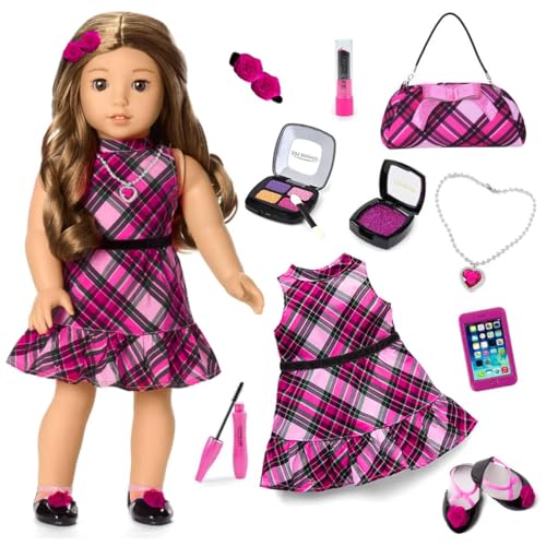 Click for More Images Dress And Makeup for 18 Inch Doll:The fashion outfits, tote bag, necklace and other accessories can perfect fit 18 inch girl doll and the other 18 inch girl dolls.Package List:The fashion girls makeup theme accessories...