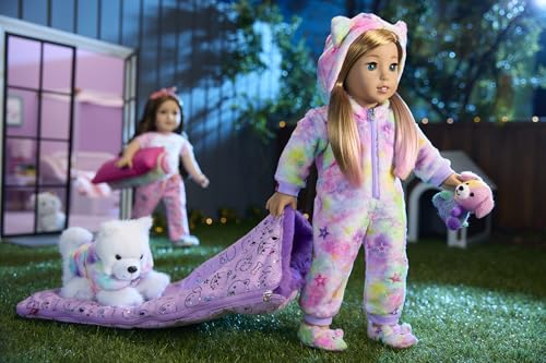 Click for More Images Includes: A purple fuzzy sleeping bag with a built-in pillow, an allover rainbow-foil pet print, and faux-fur interiorA multicolored knit stuffed dog—a gift from Summer’s Aunt OliviaDoll sold separately. More...