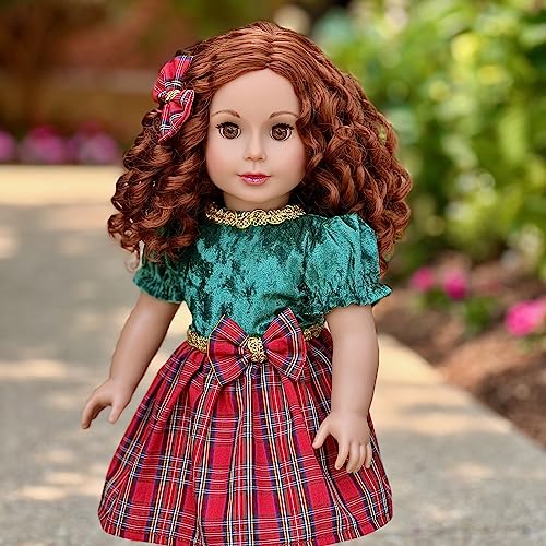 Click for More Images Holiday party dress with greet velvety top embroidered with golden ribbon at the neck and waist, red plaided skirt with decorated bow at waist and for hair and red shoes with black bow.18 inch doll clothesDesigned in the...