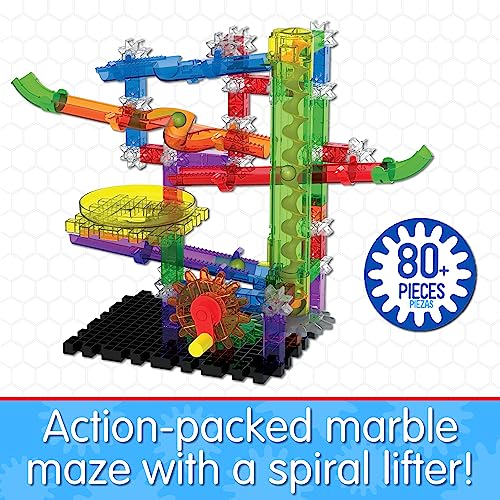 Click for More Images KEY FEATURES – Techno Gears Marble Mania Zoomerang 2.0 STEM construction set features 80+ brightly colored interlocking pieces, base plates, 3-D connectors, a corkscrew marble lifter, a funnel marble drop, and a step by...