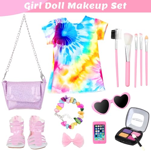 Click for More Images ?Package Included?18 inch girl doll makeup set included Doll dress*1,Doll makeup Makeup brush*5,Eye shadow*1,High-top sandals*1, Shoulder bag*1,Colorful necklace*1,Bow hair clip*1,Sunglasses*1,Cellphone*1,total 13 Pcs....