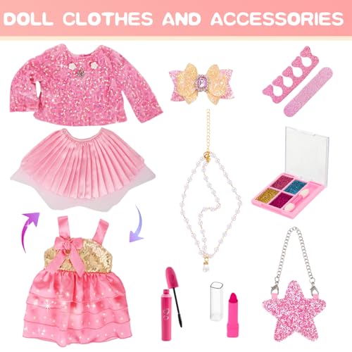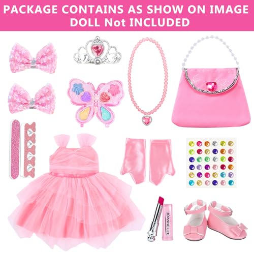 Click for More Images Doll Accessories: suitable for 18-inch dolls. We provide a full set of doll makeup sets, including pink princess dress, crown, necklace, lipstick, makeup palette, nail set, bag, gloves, shoes, sticky rhinestones, hair clips...