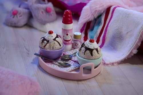 Click for More Images Two pretend ice cream sundaes with vanilla ice cream, chocolate syrup, rainbow sprinkles, whipped cream, and a cherry on topOne purple bowl, one aqua bowl, two metal spoons, and two fabric napkins with rainbow-sprinkle...