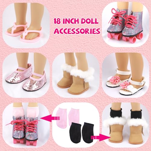 Click for More Images You will receive 5 pairs of snow boots/roller skates/sandals/flip-flops/dancing shoes 18” cute shoes for dolls to wear, and 2 pairs of socks (black and pink)Five different styles of doll shoes can be easily matched with...