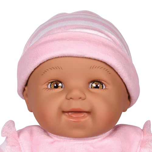 Click for More Images 18" Soft-bodied baby doll with rotatable arms and legsAdorable baby doll is soft and cuddly with big hazel eyes and smiling faceWearing a beautiful onesie with matching pink beanieSippy cup with lid included More...