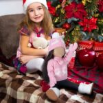 • Holiday party dress with greet velvety top embroidered with golden ribbon at the neck and waist, red plaided skirt with decorated bow at waist and for hair and red shoes with black bow.